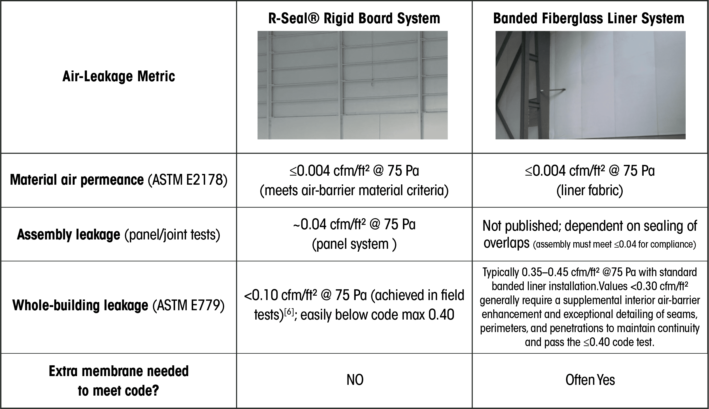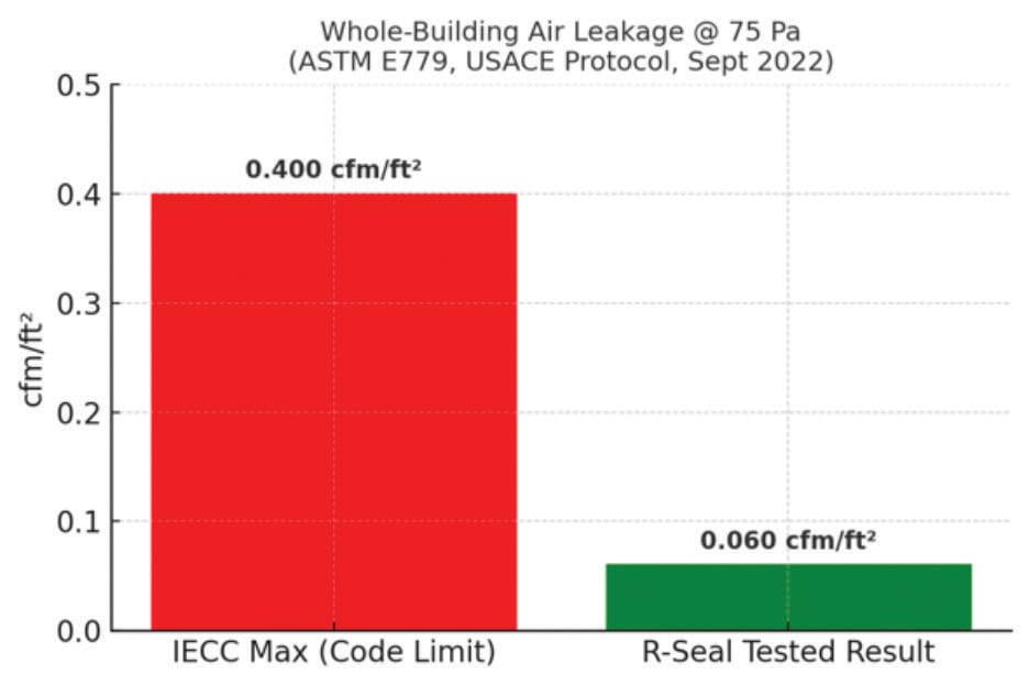 - Demonstrates code head-room comparable to R-Seal’s documented 0.10 cfm/ft² field average, giving owners predictable compliance margins.